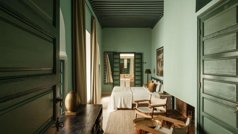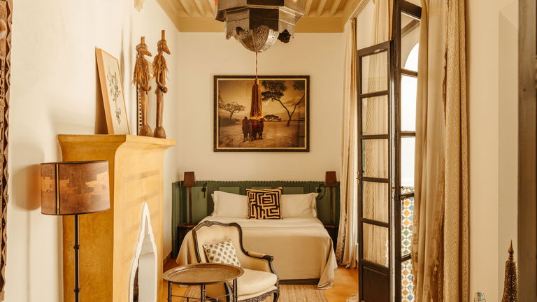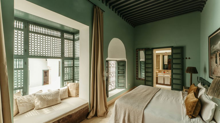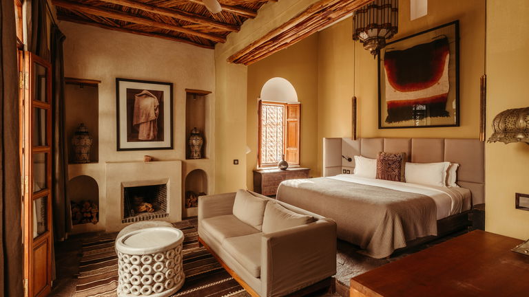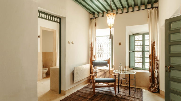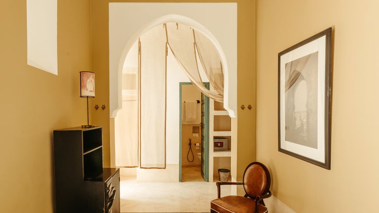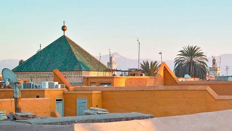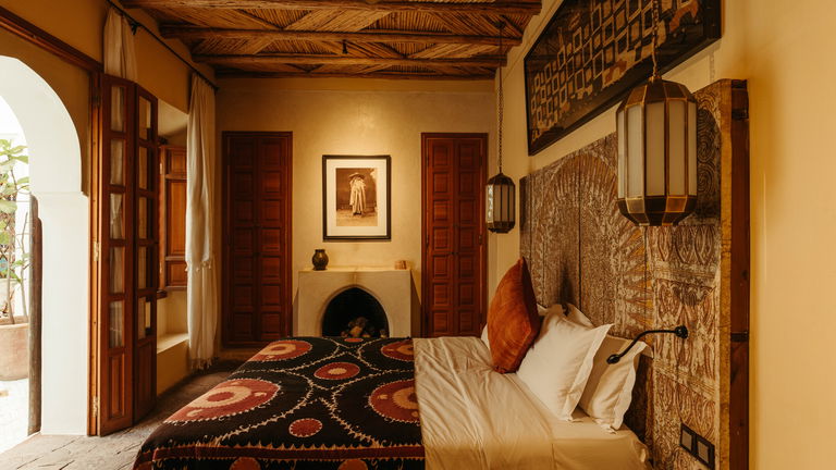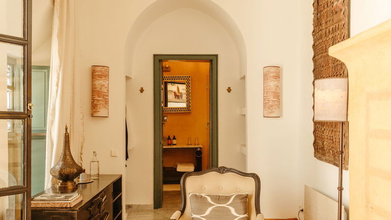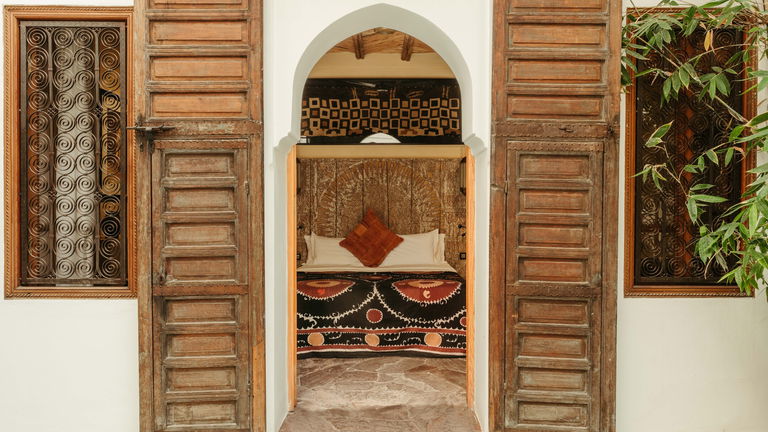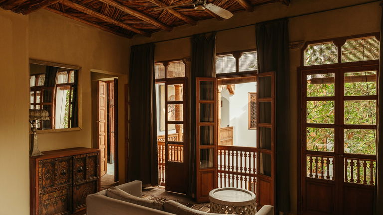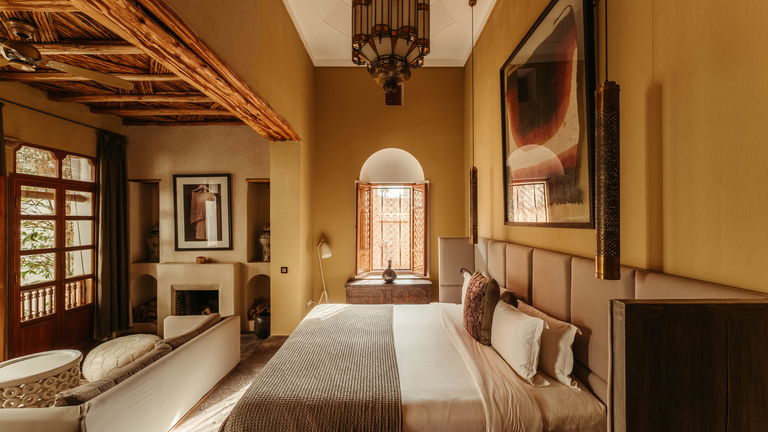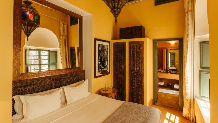 It includes two large en-suite rooms, which have five meter high wooden ceilings with beautiful hand-painted decorations, dating back 300 years in Morocco history. These were the former original rooms of this riad in Marrakech.