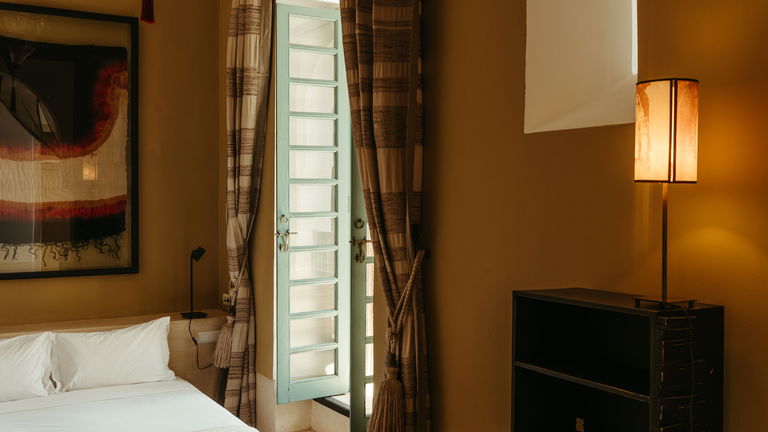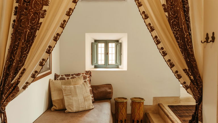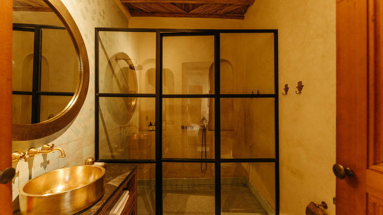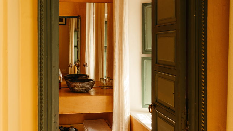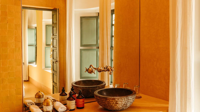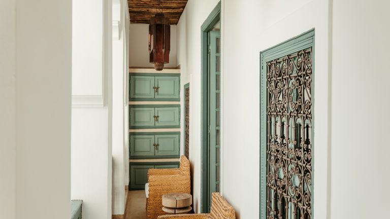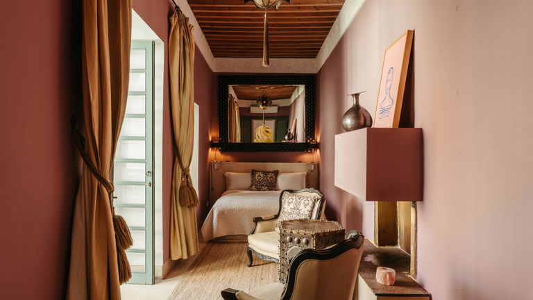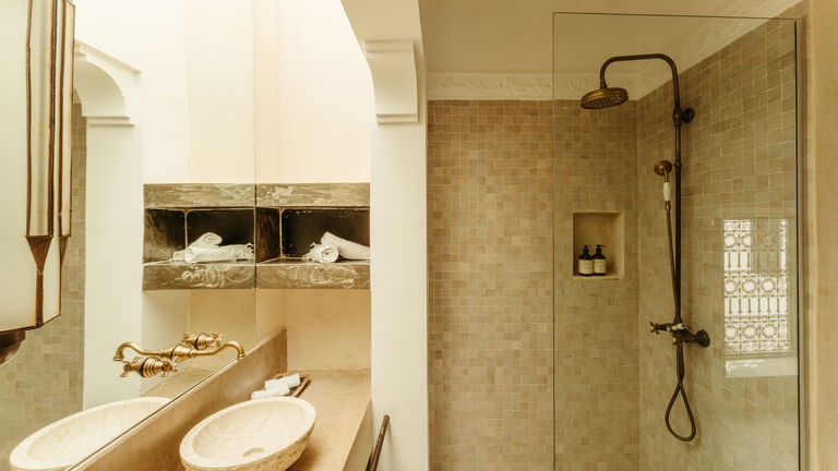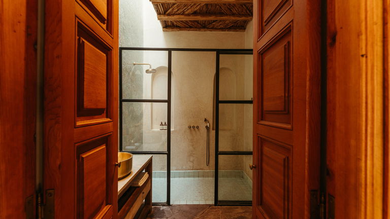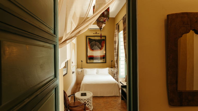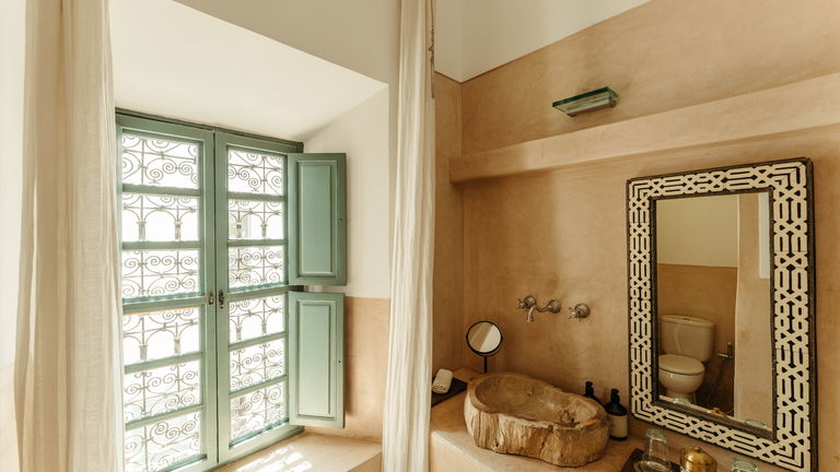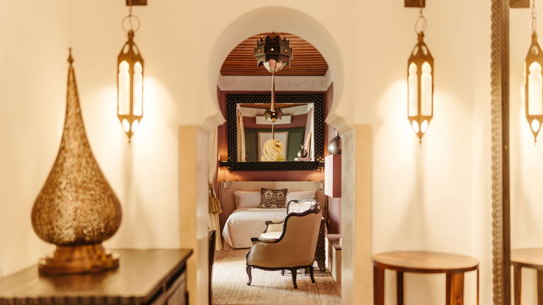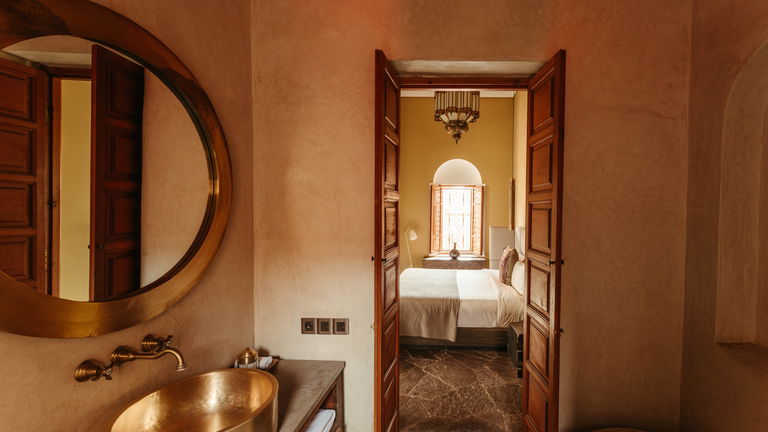 It includes two large en-suite rooms, which have five meter high wooden ceilings with beautiful hand-painted decorations, dating back 300 years in Morocco history. These were the former original rooms of this riad in Marrakech.