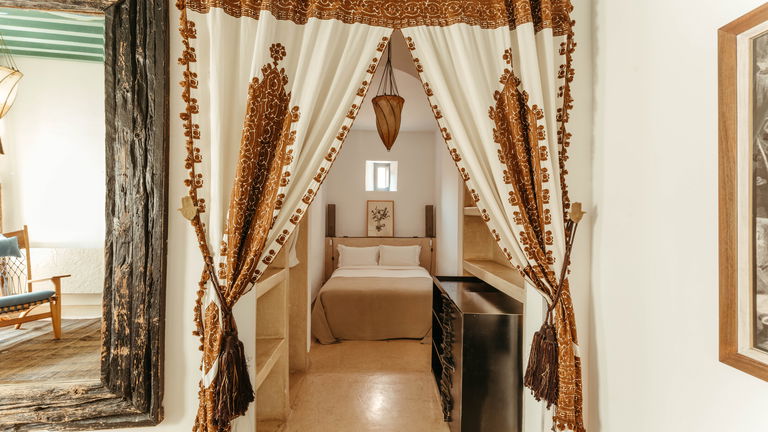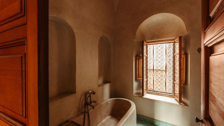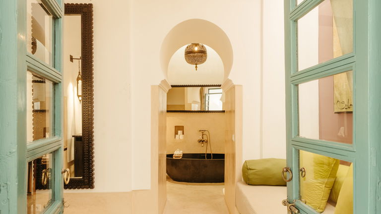 The large bedroom has a huge, freestanding tadelakt bathtub under the colorful azouak painted ceiling.